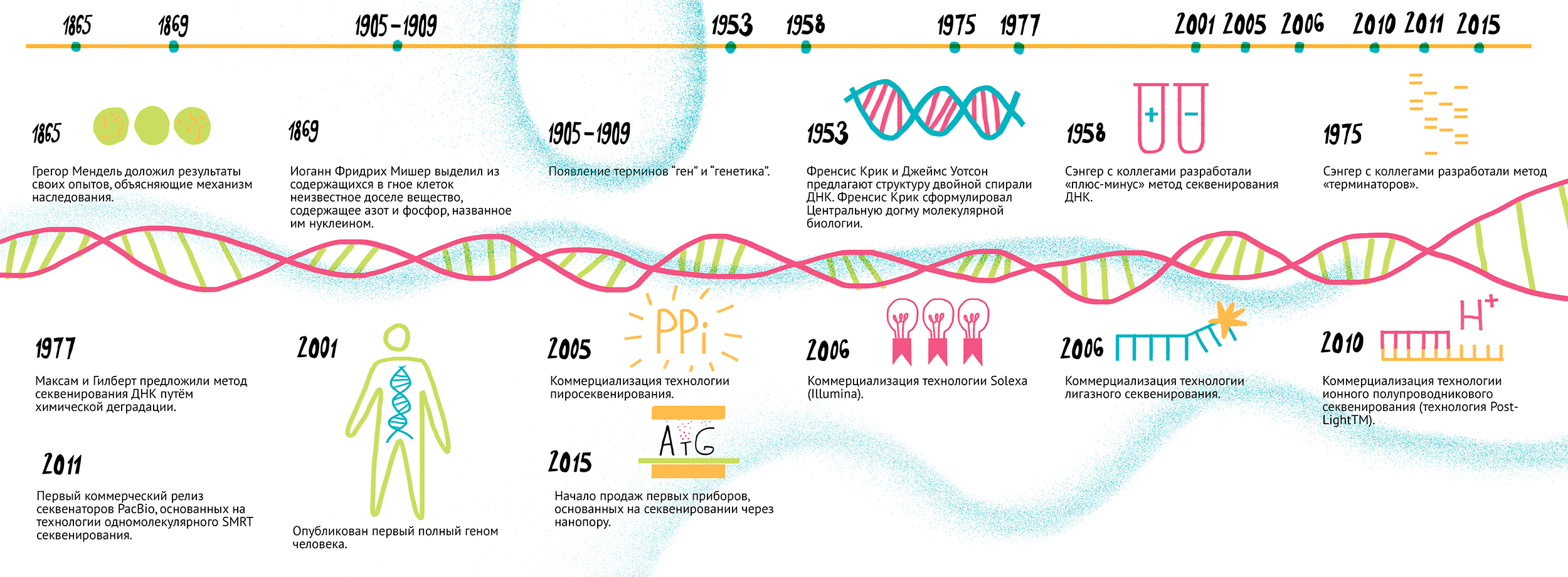 - Секвенирование ДНК: ДНК фрагментируется и подвергается секвенированию, то есть определяется последовательность нуклеотидов (строительных блоков ДНК)․